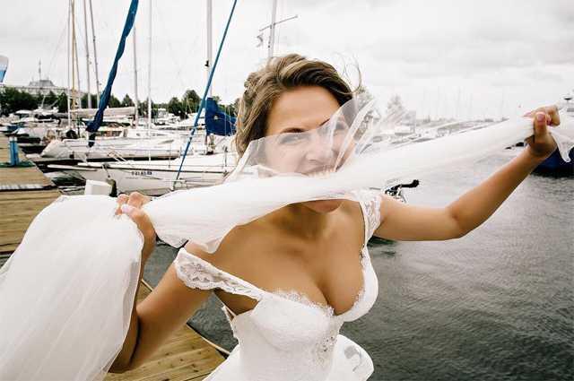 На регистрации она была одета в подвенечное платье с пышней юбкой, украшенной кружевами, а на вечере порадовала гостей коктейльным нарядом молочного цвета. Жених нарядился в соответствии с тематикой вечера в морской наряд, приплыв за возлюбленной на семейной лодке счастья.