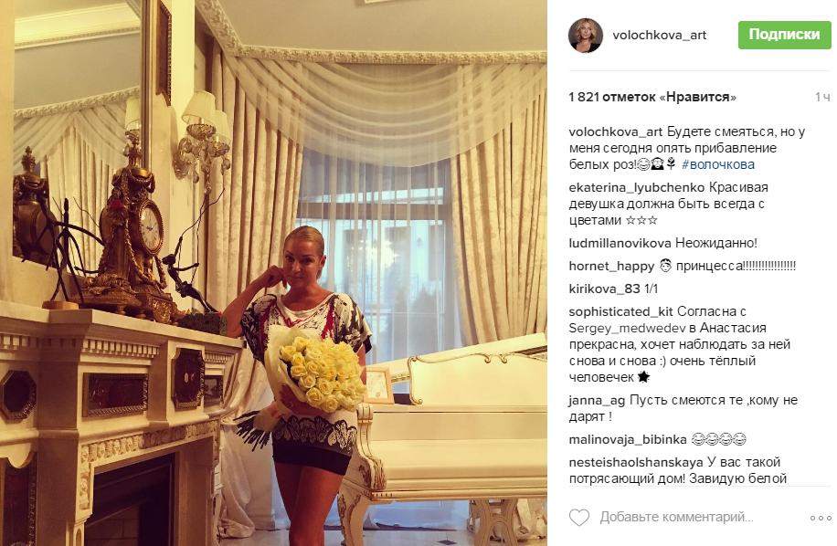 Сегодня традиция продолжилась: Волочкова выложила в Instagram фотографию с новым букетом белых роз. "Будете смеяться, но у меня опять прибавление белых роз", - написала счастливая Анастасия.