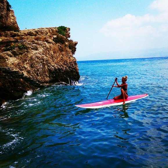 Лопырева опубликовала красивый снимок, на котором запечатлено, как она стоит на доске для серфинга и держит в руках весло.
