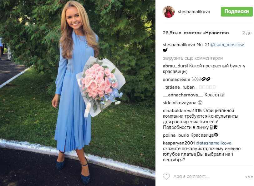 В День знаний девушка выложила снимок в свой Instagram, похваставшись дорогой покупкой. Завершающим штрихом образа стали синие туфли, которые идеально подходили под платье Стеши. Выяснилось, что на мероприятии девушка присутствовала не одна: вместе с ней был и звездный отец Дмитрий Маликов.