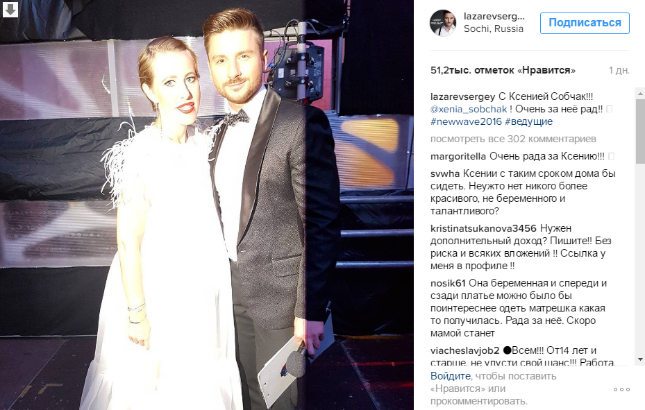 Одной из ведущих этого мероприятия уже по традиции была Ксения Собчак. Как известно, она ждет ребенка, но, судя по совместному снимку, который разместил в своем блоге ее соведущий Сергей Лазарев, беременность Ксении вовсе не идет.