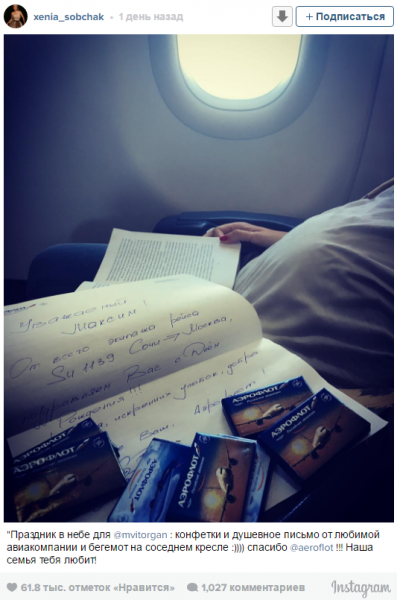 Впрочем, журналисты уже не раз ловли ее, когда она не скрывала свой живот. А недавно Ксения сама опубликовала фото с борта самолета, и подписала снимок: «Праздник в небе для @mvitorgan : конфетки и душевное письмо от любимой авиакомпании и бегемот на соседнем кресле )))) спасибо @aeroflot!!! Наша семья тебя любит!».