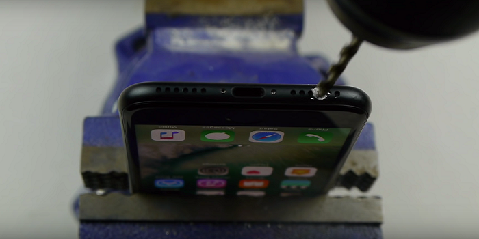 Для этого автор видео использовал сверло. Сделав дырку в телефоне, он подключил к нему наушники, музыку через которые, конечно, не было слышно. Демонстрируя телефон, автор отметил, что видео поможет тем, кто не хочет использовать оригинальные беспроводные наушники за $159.