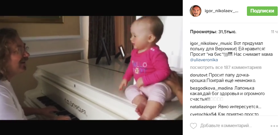 Недавно Игорь выложил забавный видеоролик с участием дочери. На видео музыкант сыграл польку. На рояле в это время сидела Вероника, которая заинтересованно наблюдала за игрой своего отца. Оказалось, что польку написал сам Николаев специально для своей дочери.