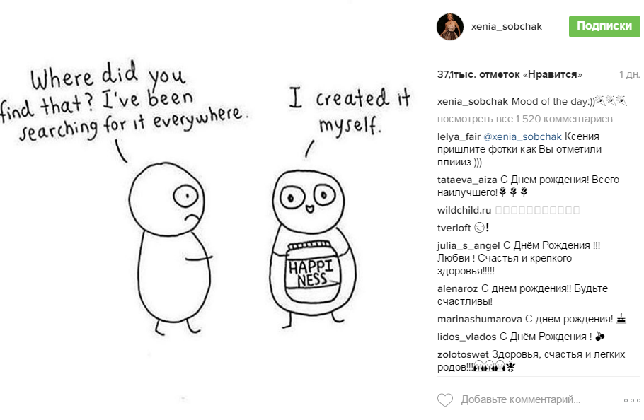 Вчера, 5 ноября, свой 35-й день день рождения праздновала известная телеведущая Ксения Собчак. Звезду поздравляли ее хорошие друзья, а также многочисленные поклонники. Сама Ксения пока что не выложила ни одного снимка с празднования. Вместо этого она поделилась забавной картинкой, которая удивила поклонников.