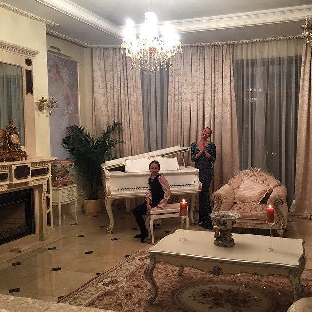 На фотографии девочка сидит со звездной мамой в своей детской. К слову, интерьер комнаты очень напоминает музей, позолоченные люстры свисают с потолка, на стенах выложены фрески с изображением известной мамы Анастасии Волочковой, возле окна, занавешенного бархатными шторами, стоит рояль, на полу персидский ковер.