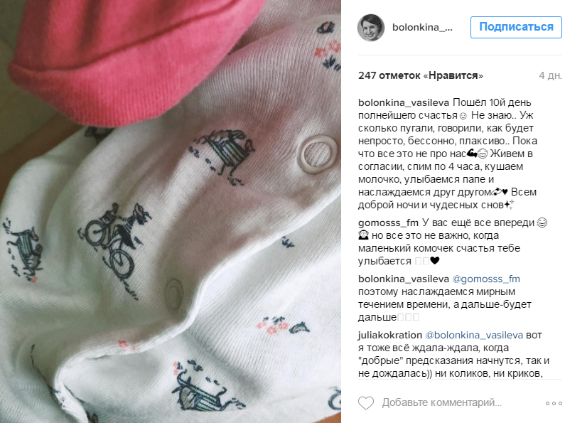 В это время Мария Болонкина находится дома и уделяет все свое время маленькой дочери. Девушка призналась, что раньше ее "запугали", рассказав о трудностях материнства, однако пока что она только радуется своей доченьке. "Живем в согласии, спим по 4 часа, кушаем молочко и улыбаемся папе", - поделилась актриса своими впечатлениями.