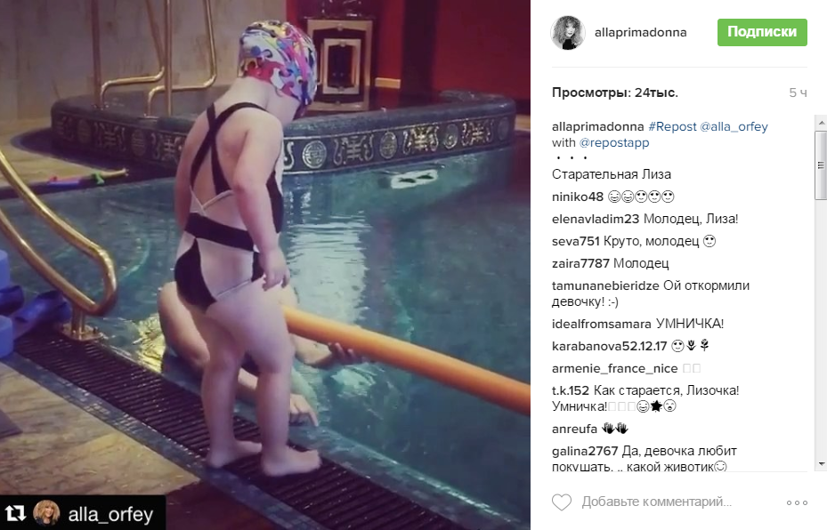 Недавно пользователи соцсети смогли посмотреть ролик, на котором дочка Примадонны занимается плаванием. Алла Борисовна рада, что Лиза растет активной и упорной.