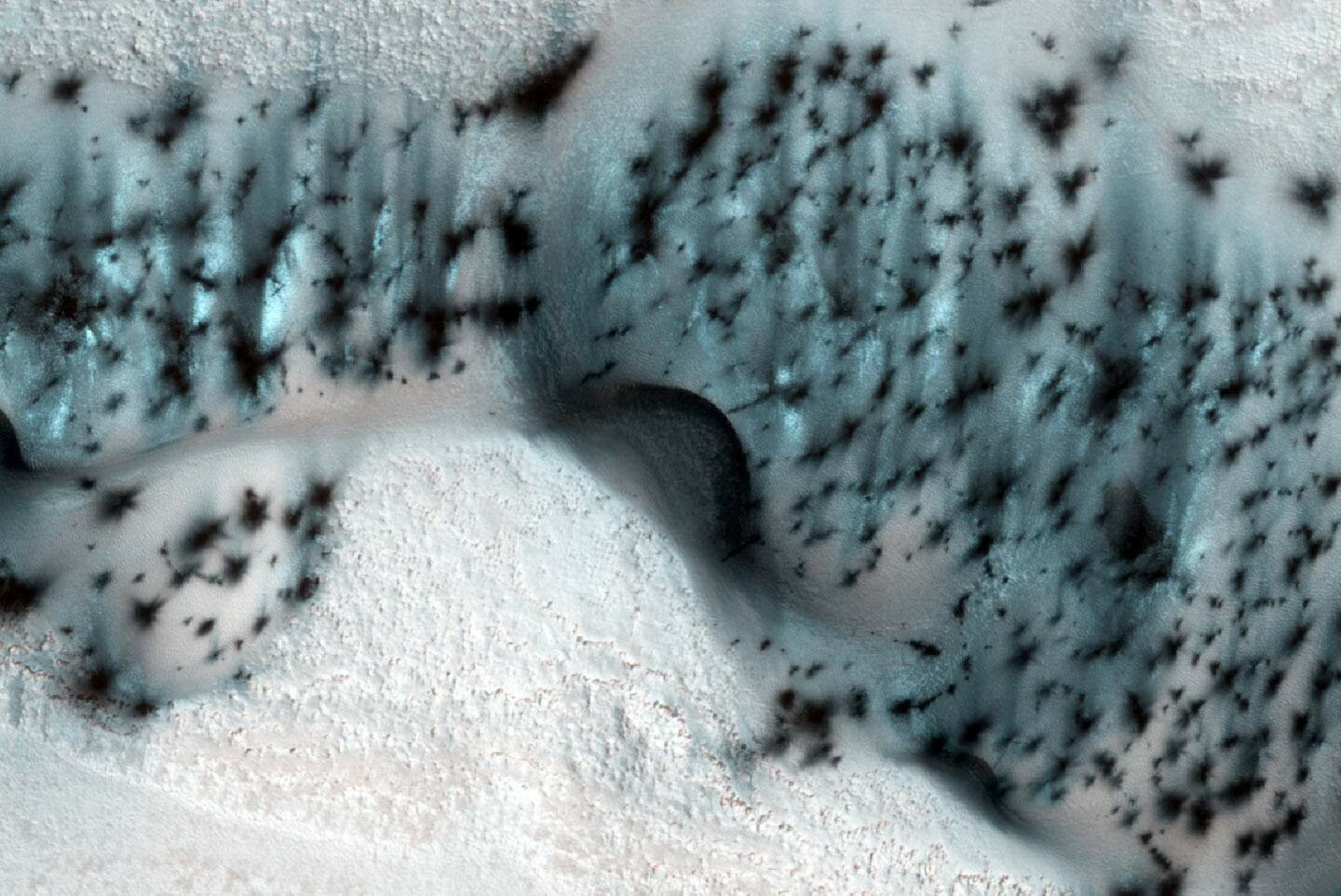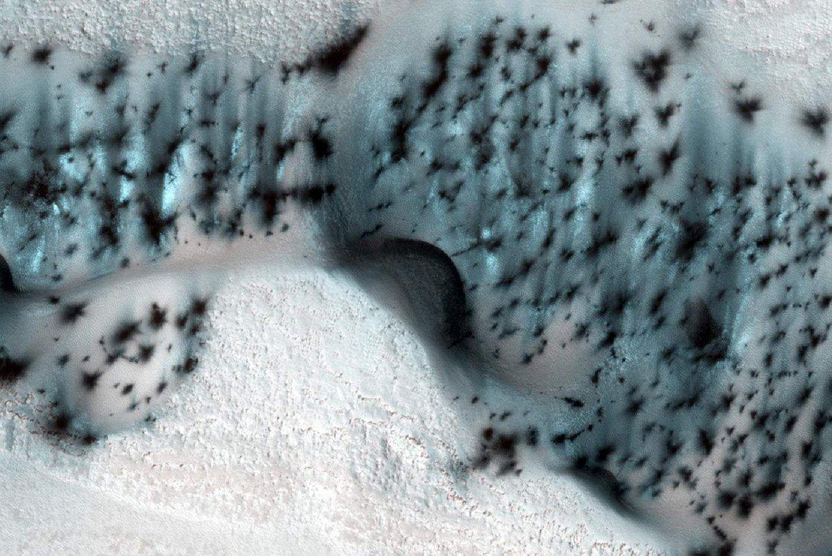 Космічний зонд Mars Reconnaissance Оrbiter зробив фотознімок на поверхні Червоної планети, яка раптово була встелена снігом і замерзлим вуглекислим газом. Дане фото зроблено за допомогою зонда Mars Reconnaissance orbiter в перший день марсіанської зими в північній півкулі планети.