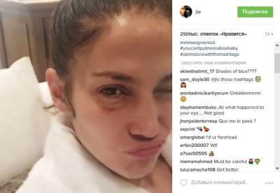 На своей странице в Инстаграм знаменитость опубликовала селфи, на котором предстала с фингалом под глазом. Певица и актриса не уточнила, что с ней случилось, а подписала кадр так: "Иногда работа может быть жестокой".