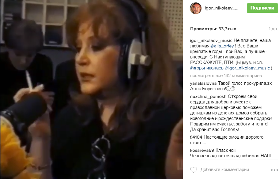 На видео Алла Борисовна слушала свою песню "Расскажите, птицы" и курила. Судя по всему, звезду сильно затронула песня, так как в один момент она расплакалась и начала вытирать глаза от набегавших на них слез. "Не плачьте, наша любимая Алла Борисовна! Все Ваши крылатые годы - при вас, а лучшие - впереди", - прокомментировал видеоролик Николаев.