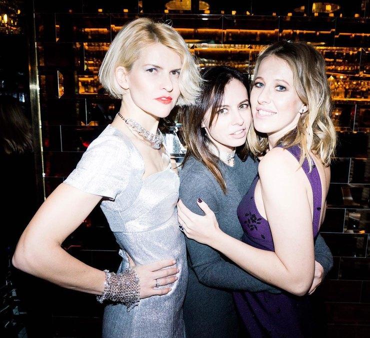 На вечер были приглашены Оксана Лаврентьева, Татьяна Навка, Ксения Собчак, Полина Киценко, Владимир Пресняков, Екатерина Мухина, Яна Рудковская и многие другие. Все собравшиеся поздравляли именинниц, но и не смогли пройти мимо Ксении Собчак, которая месяц назад стала мамой сына. Гости вечера отметили, что Ксения прекрасно выглядит, она похудела и вернулась в форму. Полина Киценко, одна из лучших подруг Ксении, написала в Instagram: «На режиме „джинглбеллз“ с худой уже Ксенией Собчак». Ксения надела потрясающее платье Rasario с цветочным принтом и бахромой, дополнила образ темными бархатными туфлями.