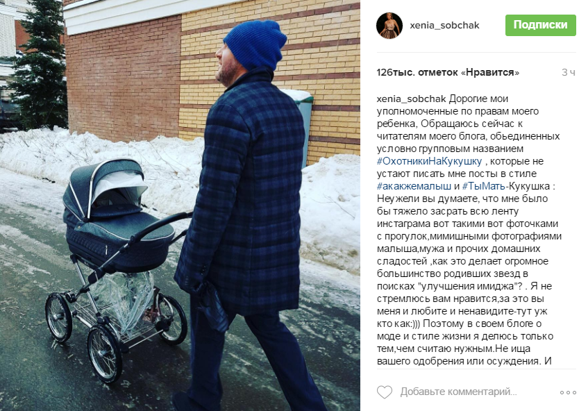 Ксения Собчак родила первенца 18 ноября в одной из элитных клиник Москвы. После выписки из роддома Ксения не стала долго засиживаться дома: звезда часто посещает публичные мероприятия и встречается с подругами. Это не нравится многим фолловерам Ксении, которые убеждены, что молодая мама должна все время проводить со своим малышом. Именно они прозвали звезду "матерью-кукушкой".