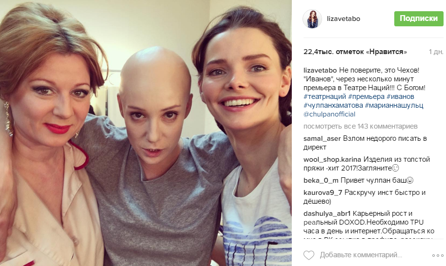 Поклонники были шокированы новым имиджем Чулпан. "Чулпан лысая?", "Я в шоке, это Чулпан?" - вопрошали удивленные пользователи. Некоторые не одобрили смелый шаг знаменитости. "Скажите, что это грим и лысина ненастоящая", - высказывались растроенные фолловеры, однако Боярская не ответила на негативные комментарии пользователей.