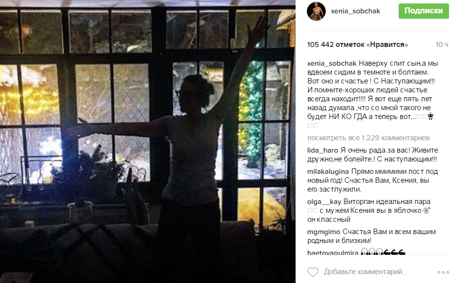 Однако, судя по всему, знаменитость очень ценит свой домашний уют. На днях Ксения опубликовала новый пост в Instagram, в котором кратко подвела итоги прошедшего года. "Наверху спит сын, а мы вдвоем сидим в темноте и болтаем, - рассказала знаменитость о прошлом вечере, - вот оно и счастье!"