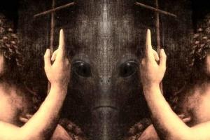 Для обнаружения пришельца необходимо рассмотреть картину по горизонтали. Просмотрев полученное видео, можно увидеть, как пошагово получается образ грушевидной головы человекоподобного существа с высоким лбом, огромными глазами, тонким ртом и маленькими ноздрями.