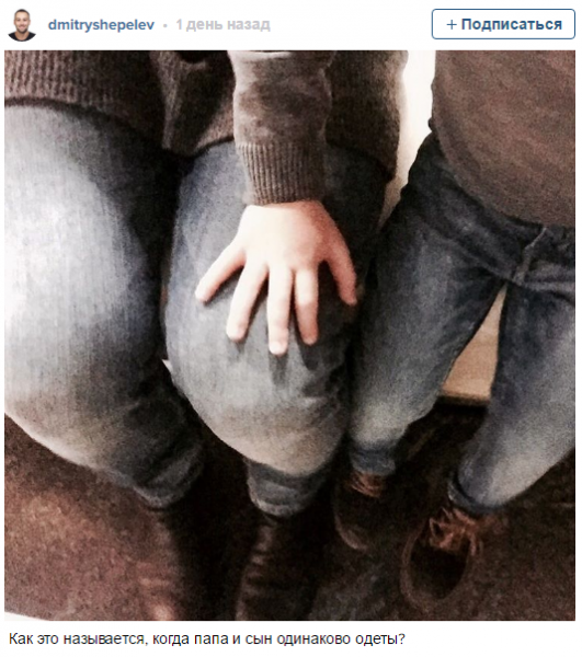 Дмитрий сделал «модное» селфи в стиле «фэмилилук», на котором запечатлел себя и сына в одинаковых нарядах. Правда, Шепелев решил не показывать лица сына. В кадре оказались лишь ноги и рука Платона.