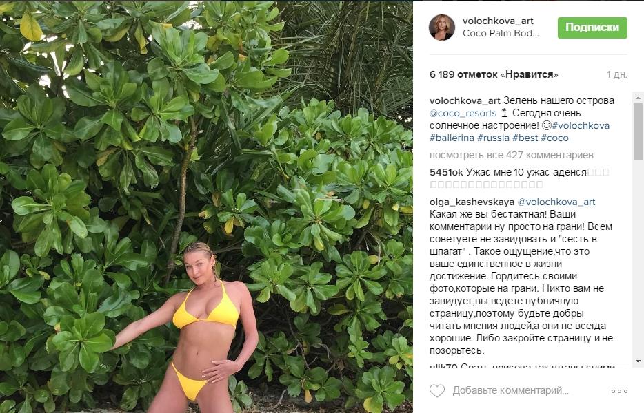 Известная балерина Анастасия Волочкова в настоящее время отдыхает на Мальдивах, где делает фирменные шпагаты и загорает в миниатюрных бикини. Не забывает Настя о своих поклонниках и публикует в Инстаграм новые эротичные снимки.