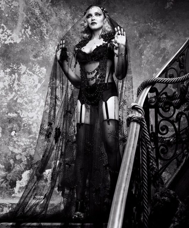 Сама фотосессия двух фотографов - Луиджи Мурену и Янго Хенце - выполнена в черно-белых тонах, а поп-дива там позирует я нижнем белье, корсетах и прозрачных платьях.