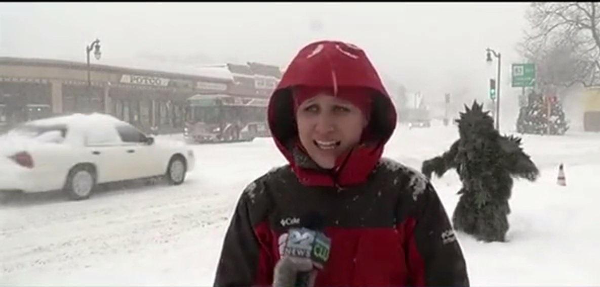 Ведущая телеканал 22 News рассказывала об аномальных метелях в городе, как неожиданно за ее спиной прогуливался снежный человек.