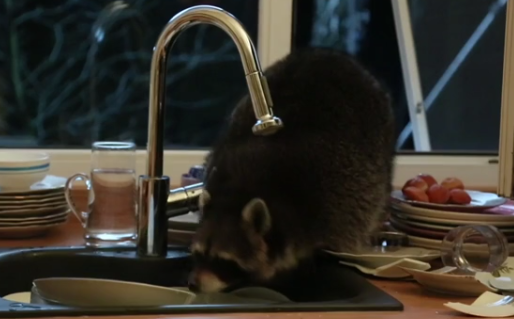 Как утверждает казахстанский информационный портал Tengrinews, енот занимался мытьем тарелок на кухне жителей Алма-Аты. Хотя, по всей видимости, животное просто лакомилось остатками еды, окуная кусочки в воду.