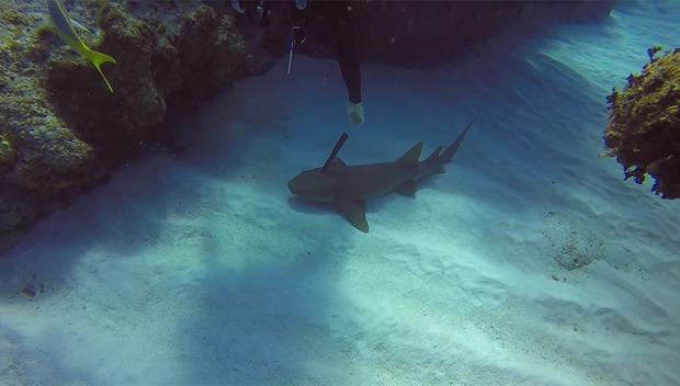 Сопровождавший группу инструктор Бен Джонсон заметил рядом с рифом метровую акулу, которая вела себя необычно, кружа на одном месте. Приблизившись, чтобы посмотреть поближе, дайвер заметил, что из головы акулы торчит нож. Создавалось впечатление, что рыба просит о помощи, поэтому Бен подплыл к акуле сверху и осторожно достал нож из головы животного.