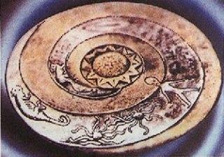 Этому каменному блюду около 12 тысяч лет. Каменный диск был плоским, с изображением солнца в центре, из которого выходят два спиральных рукава, заканчивающиеся на краю. На диске есть изображения поверх спиралей.