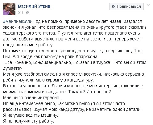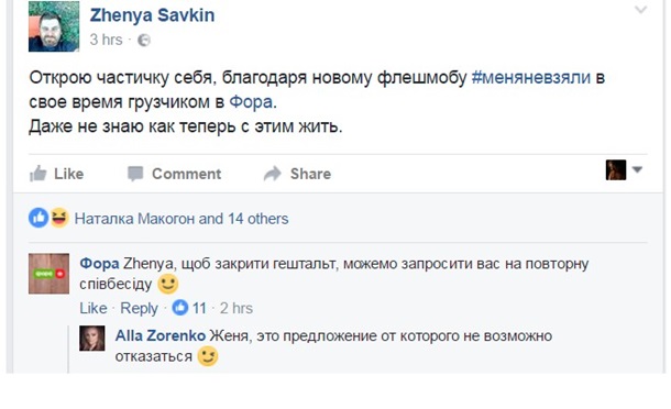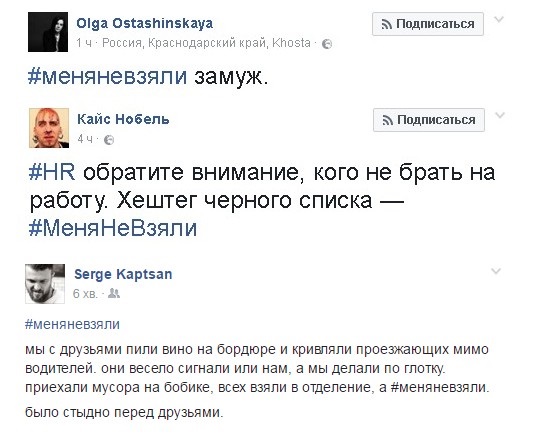 В Facebook огромную популярность набирает хэштег #МеняНеВзяли, в котором пользователи сети делятся своими историями о попытках устроиться на работу, неудачных собеседованиях, отказах и так далее.
