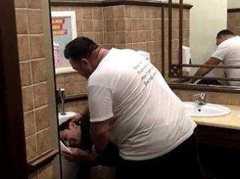 В ролике видно, как Сергей пытается окунуть своего коллегу головой в унитаз.