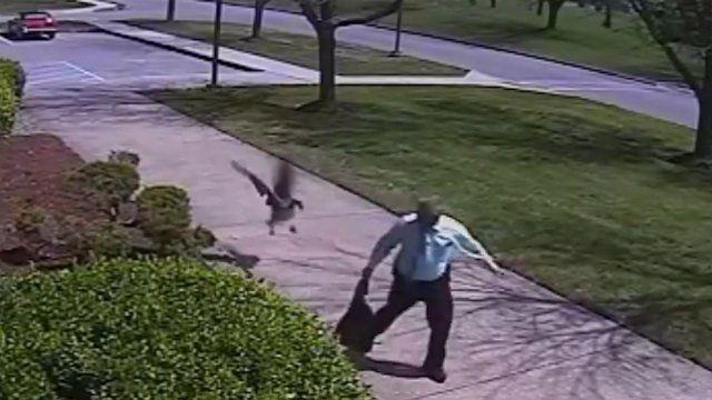 Нападение птицы на полицейского детектива Рэя Холла из Кларксвилла попало в объектив камеры видеонаблюдения 13 апреля, когда офицер намеревался войти здание участка.