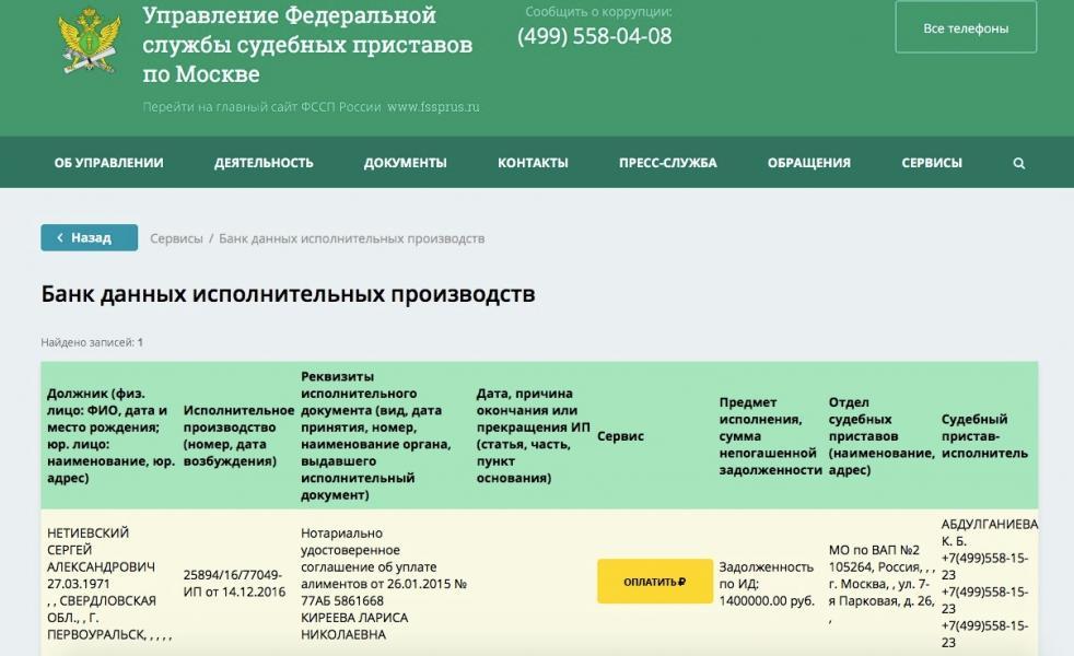 Сейчас информация с сайта пропала. Журналисты звонили в Службу судебных приставов, чтобы узнать, в чем дело. Там им ответили, что злостный неплательщик алиментов Нетиевский после выхода статьи задолженность погасил. Молодец!