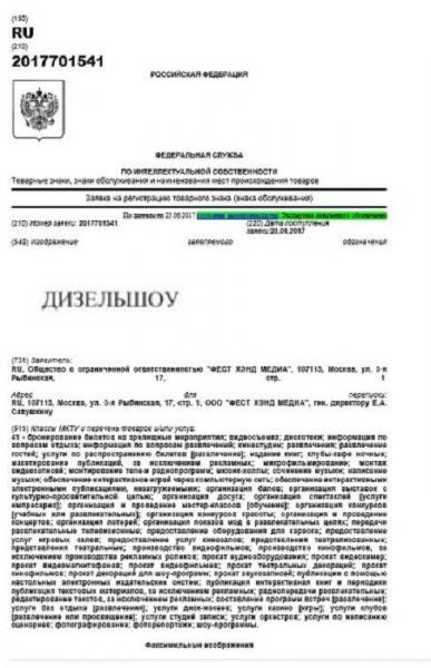 Однако от подачи в Роспатент заявки он всячески открестился. Мол, всего-то обратился туда с просьбой проверить - свободен ли товарный знак «Дизель Шоу». Понятно. Но в Роспатенте лежит именно заявка. Скриншот, как всегда, прилагается.