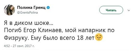 Сама девушка шокирована смертью своего коллеги. Рано утром в своем Твиттере она написала о гибели Егора: