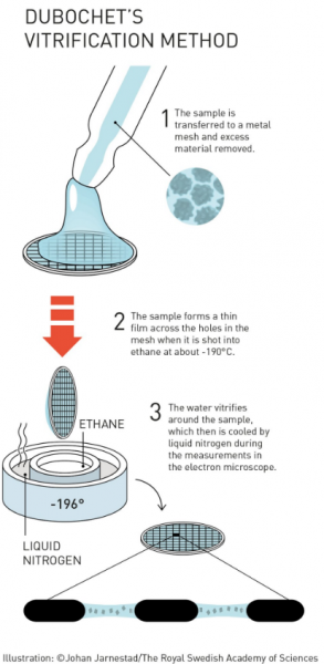 В этом году Нобелевская премия по химии досталась швейцарцу Жаку Дюбоше, американскому ученому немецкого происхождения Йоахиму Франку и Ричарду Хендерсону из Великобритании. Они разработали криоэлектронный метод микроскопического исследования, при котором молекулы замораживаются мгновенно, и их естественная структура сохраняется. Такой метод позволяет изучать обездвиженные молекулы, находящиеся в растворе, в высоком разрешении.