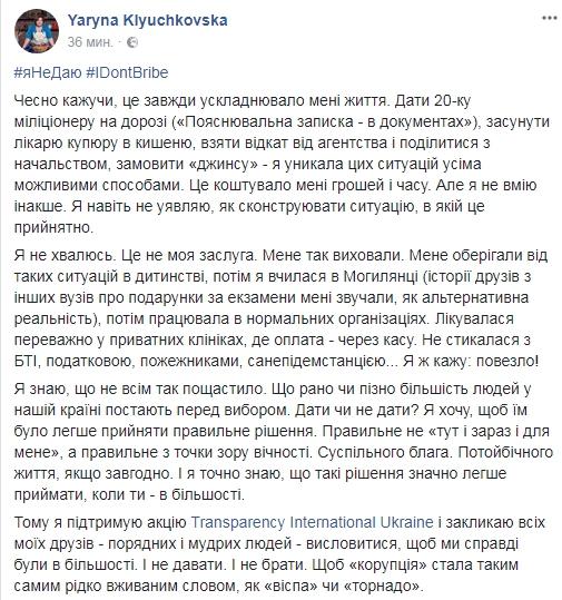 Transparency International Ukraine и Transparency International инициировали флешмоб #янедаю. В рамках его проведения каждый желающий может рассказать, почему он не дает взяток, к примеру врачам, которые намекают на «благодарность» и всегда поступает по закону.
