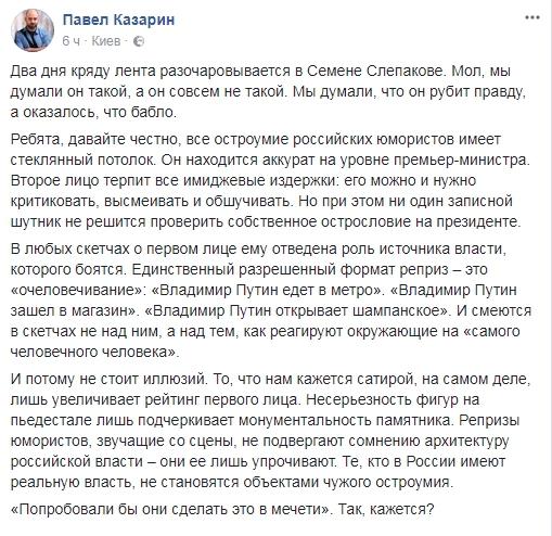О том, что Слепаков и раньше демонстрировал лояльность к кремлевскому режиму отметил в Фейсбуке украинский журналист Павел Казарин.