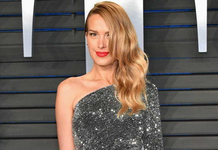 Для мероприятия, которое являлось продолжением церемонии вручения премии "Оскар", Немцова выбрала экстравагантное платье бренда Redemption с серебристым верхом на одно плечо и длинной юбкой лососевого цвета с высоким разрезом.
