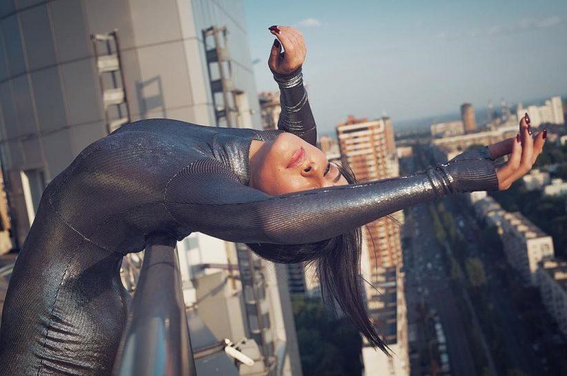 Даша позировала на крыше высотки, в обтягивающем костюме цвета металлик и в лаковых сапогах на высоких каблуках.
