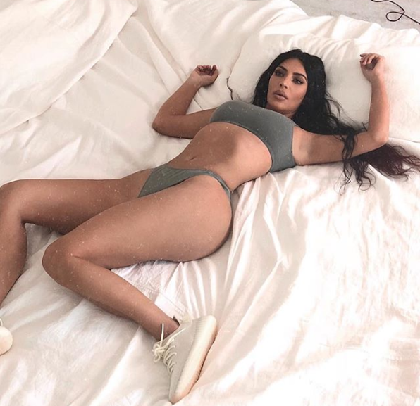 Ким выложила в Instagram фото, где она лежит на кровати в бикини и кроссовках 350 V2 Butter.