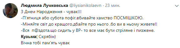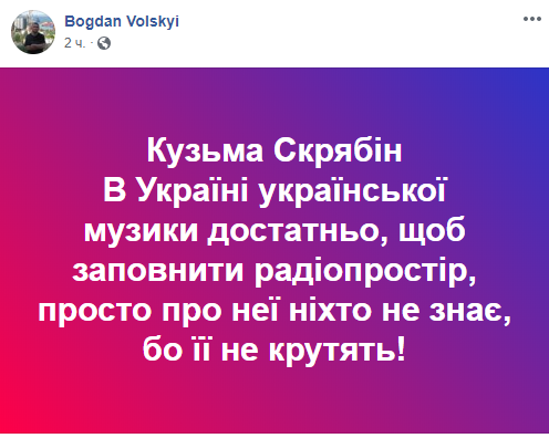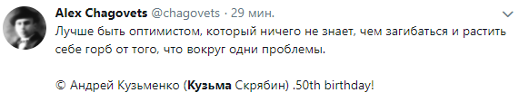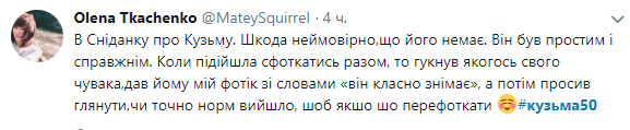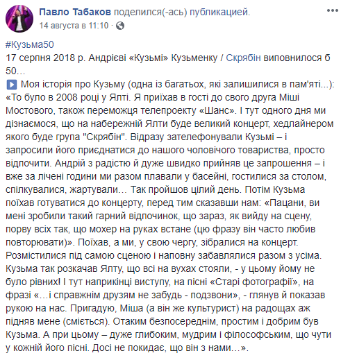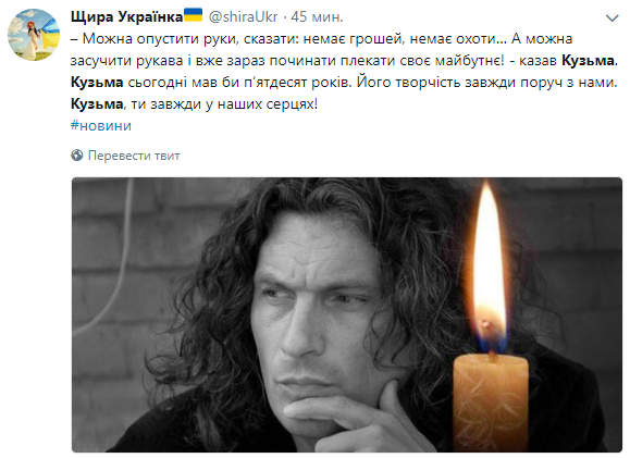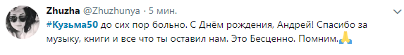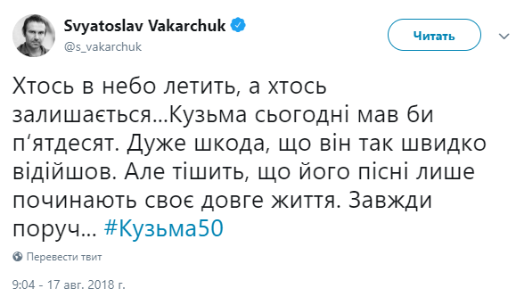 "Кто-то в небо летит, а кто-то остается... Кузьме сегодня было бы пятьдесят. Очень жаль, что он так быстро ушел. Но утешает, что его песни только начинают свою долгую жизнь. Всегда рядом..." - написал в Твиттере лидер группы "Океан Эльзы" Святослав Вакарчук.
