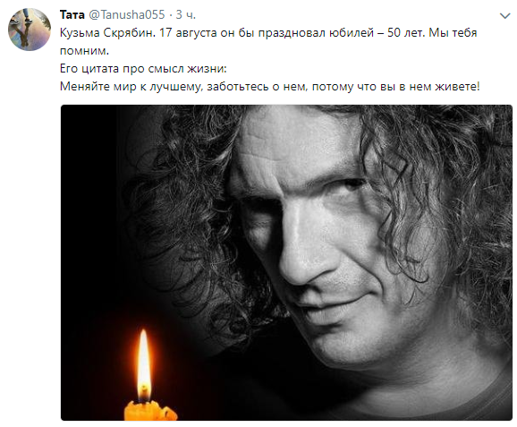 К сожалению, жизнь музыканта оборвалась 2 февраля 2015 года в результате ДТП на трассе в Днепропетровской области. Но украинцы не забывают любимого артиста. Сегодня пользователи соцсетей делятся песнями группы "Скрябин", известными цитатами Кузьмы и просто воспоминаниями о нем.