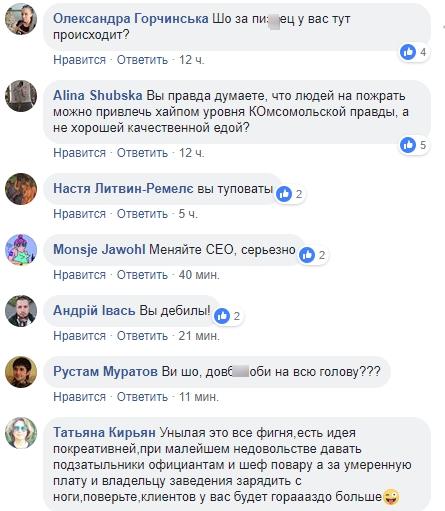 Мало кто из пользователей сети оценил креативную задумку администрации ресторана. Его страничке в Фейсбуке массово наставили "единиц" и обвалили рейтинг до 1,2 звезд. Также пользователи пишут в комментариях все, что думают о концепции заведения: