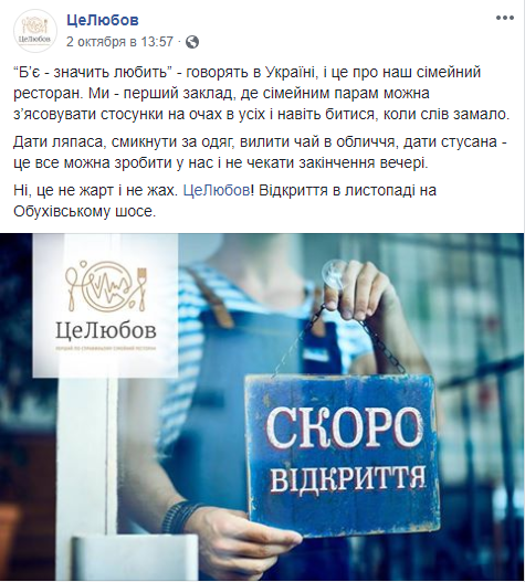 В ноябре в Киеве анонсировано открытие необычного ресторана под названием "ЦеЛюбов", где семейным парам можно будет выяснять отношения и даже драться, передает Час Пик.