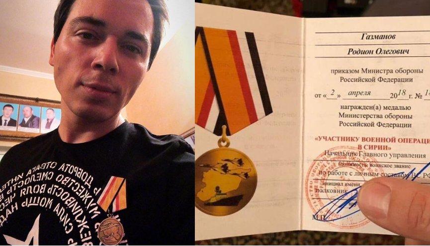 Сын ярого путинского поклонника из сферы шоу-бизнеса Олега Газманова Родион получил медаль от Министерства обороны РФ за участие в военной операции в Сирии.