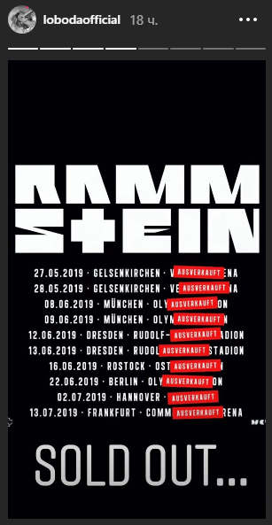 Артистка прибыла в Дюссельдорф и опубликовала в сети кадры из аэропорта, а также выложила список концертов группы Rammstein, добавив, что все билеты на шоу распроданы.