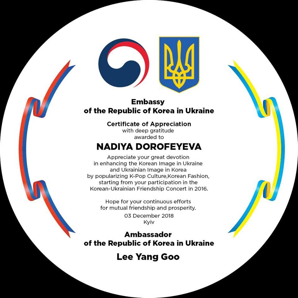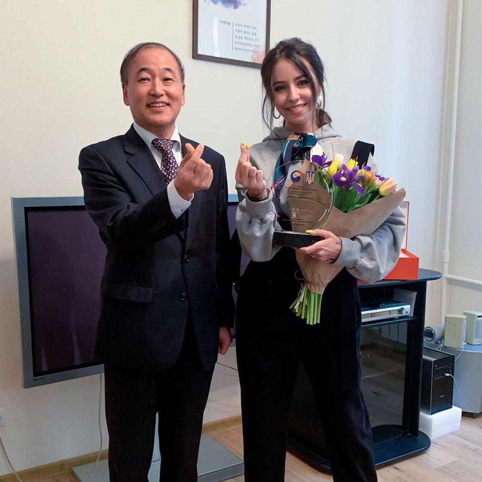 В своем Instagram Дорофеева сообщила, что Посол Республики Корея в Украине Ли Янг Гу вручил ей награду за популяризацию корейской культуры в Украине и украинской - в Корее.