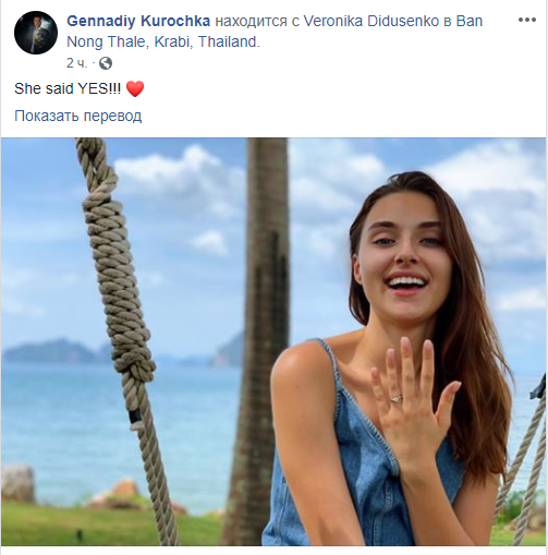 Курочка опубликовал у себя в Фейсбуке фото Вероники с кольцом на пальце и подписал: "На сказала Да!". Судя по геолокации поста, влюбленные обручились в Таиланде.