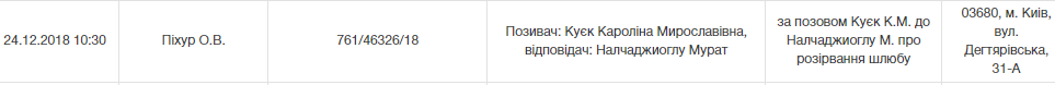 На сайте Шевченковского районного суда Киева в списке дел, предназначенных к рассмотрению, указан иск Куек Каролины Мирославовны (настоящее имя Лорак) в отношении Мурата Налчаджиоглу о расторжении брака. Заседание назначено на 24 декабря.