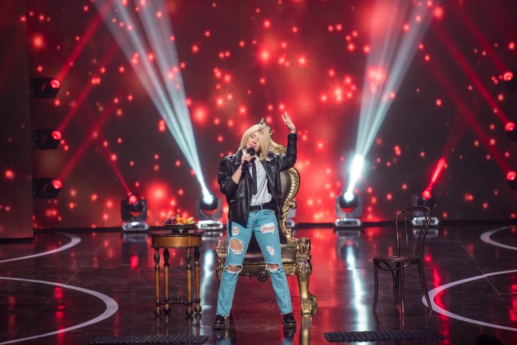 В номере "Винник" будет давать интервью "Кате Осадчей", восседая на королевском троне, после чего отправится очаровывать зрителей своим пением.
