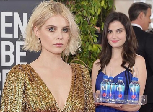 Когда кинозвезды позировали фотографам на красной дорожке, практически на всех кадрах на заднем плане оказалась девушка в синем платье, держащая поднос с бутылками воды "Fiji".